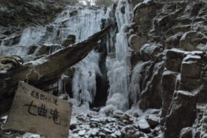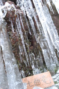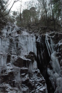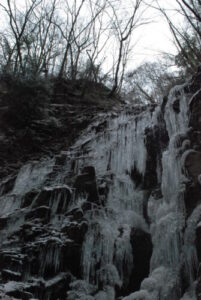氷瀑を見るにはルートを外れ通行止めしてある柵をこえて人がすれ違うのもやっとな危険な道を行くことなります。ロープが張ってあり、それを頼りに進まないと行けない断崖絶壁ゾーンもある。そこで娘が「無理」と泣きつく。これでもか!って優しさと励ましで何とかクリアし、蟇滝へ到着。そこからすぐの目的地七曲滝を目指す