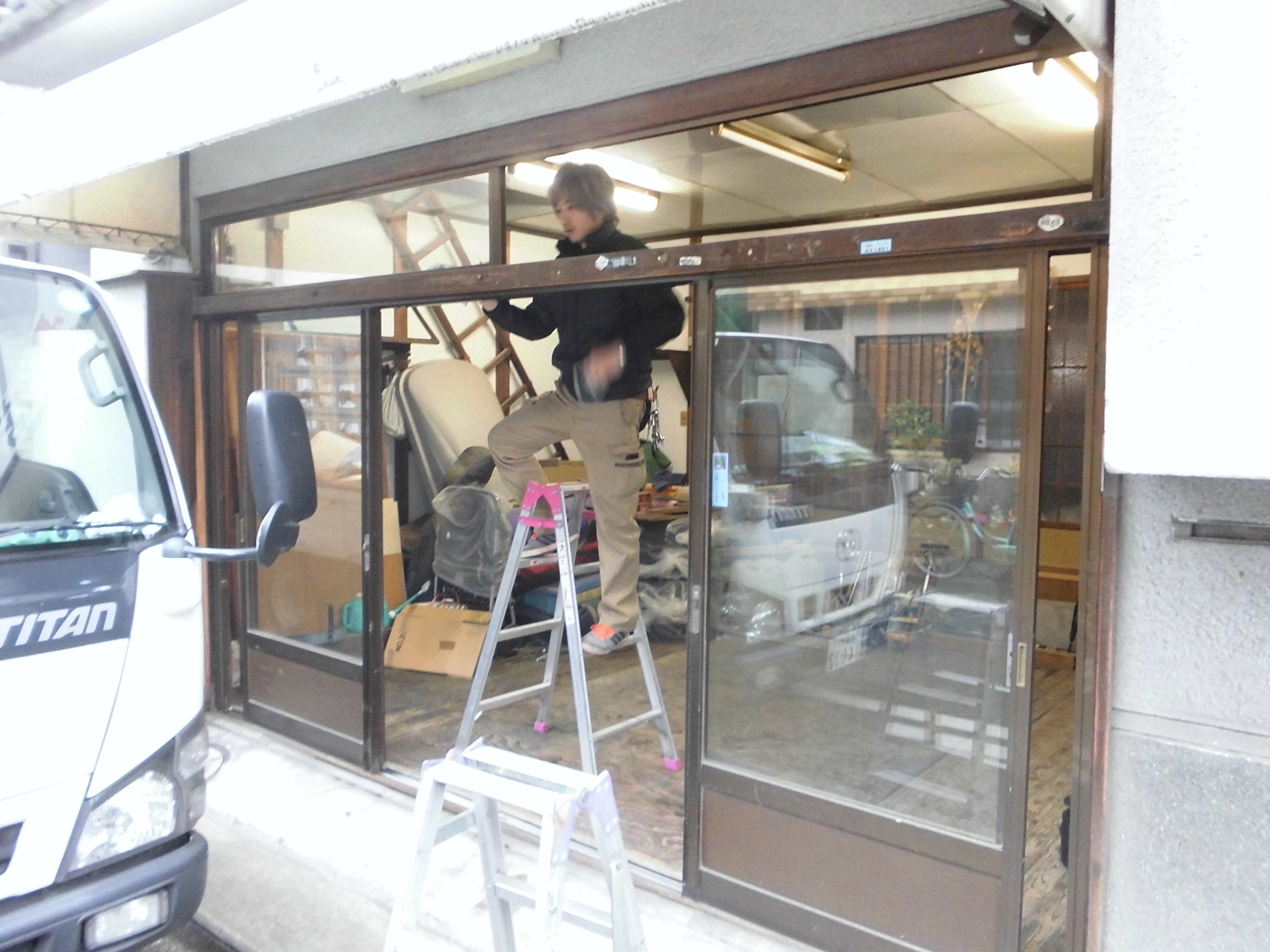 以前は店舗の出入り口として使用していたランマ付の4枚引違い戸。
