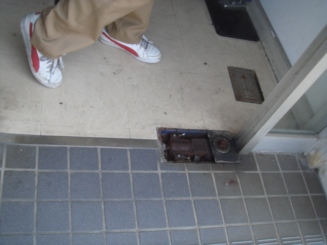 住宅のドアとは違いフロアヒンジというドアの軸を使っています(表現が難しい)。。。