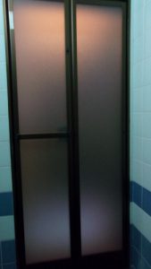 お風呂のドアにガラスは割れた時本当に危ないので近頃は100%樹脂パネルです。折れ戸に変えることで浴室側の開きスペースも小さくなるしハンドル錠も無いので錆びることも気にしなくて済みます。浴室にガラスドアが付いているお宅の方は是非相談してくださいね!