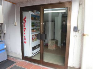 病院の出入口です。強風にあおられて扉が勢いよく開いてしまい壁、配管に激突しガラスは割れ框ドアもボコボコになってしまっておりました。職員が頻繁に通る通路なので早めになんとかしたいというご要望でした。
