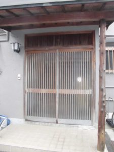 全部木製の玄関引き戸です。個人的には趣きがあって非常に好きなのですが、住んでいるい人にはそんなこと言ってられない事情がお有りです。けっこう傾いていて向かって右の戸は固定していないと隙間が空くのでご主人自ら内部側からガッツリビス止めしており見た目が非常に悪いです。