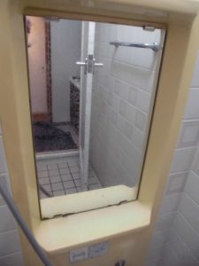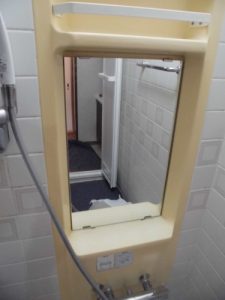 この通り取替え完了です。浴室用の鏡なので一般的な鏡でなく表面処理されているので曇らないと言えばうそになりますが曇りにくい鏡です。鏡を取り外した際に鏡の裏側も掃除しました。約20年掃除したことが無い場所なのでこれはこういう工事ならではのオプションですよね~鏡が変わるもそれ以上に喜びも増えますね。