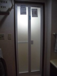 パッキンの汚れ、建付け不良、ドアであることも不便。色々あって折れ戸に取り替えたいというご相談です。何の問題もありません。YKKのドアリモ浴室折れ戸へ取り替えます。